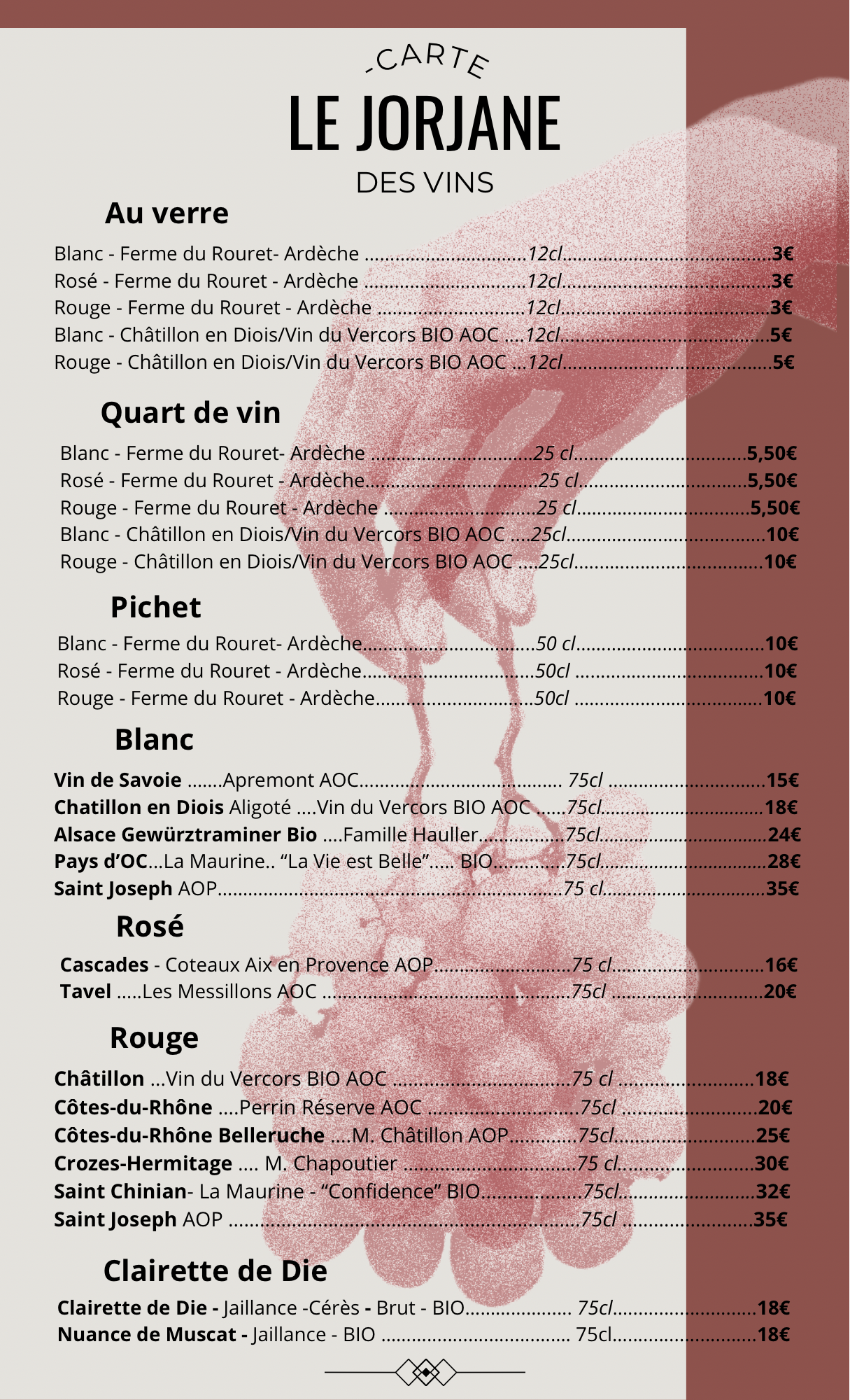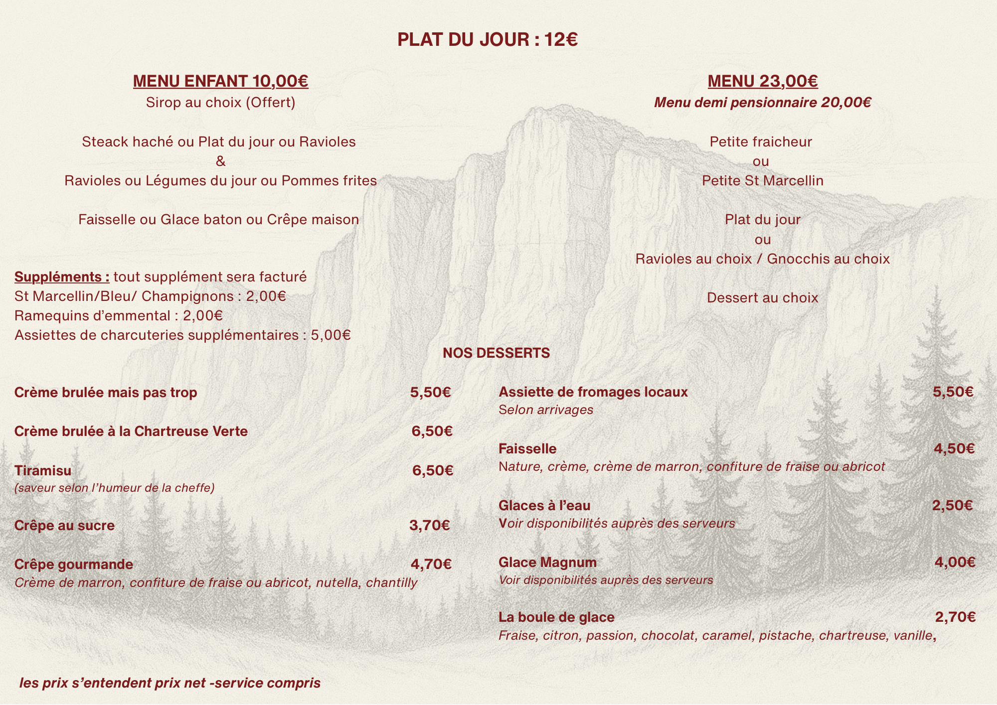 Cuisine traditionnelle et locale élaborée par notre cheffe Marine. Forte de sa passation avec l'ancien propriétaire Georges Pontvianne, Marine propose des plats que lui concoctait sa mamie à base de produits locaux (légumes de la ferme de Jordan Lyonne, légumes de saison de la ferme du Rocher, noix de la ferme Michallet, truites de la pisciculture Murgat, ravioles des Grands Goulets de la chapelle en Vercors, St-Marcellin de la fromagerie du Dauphiné, fromages de Vercorlait etc).